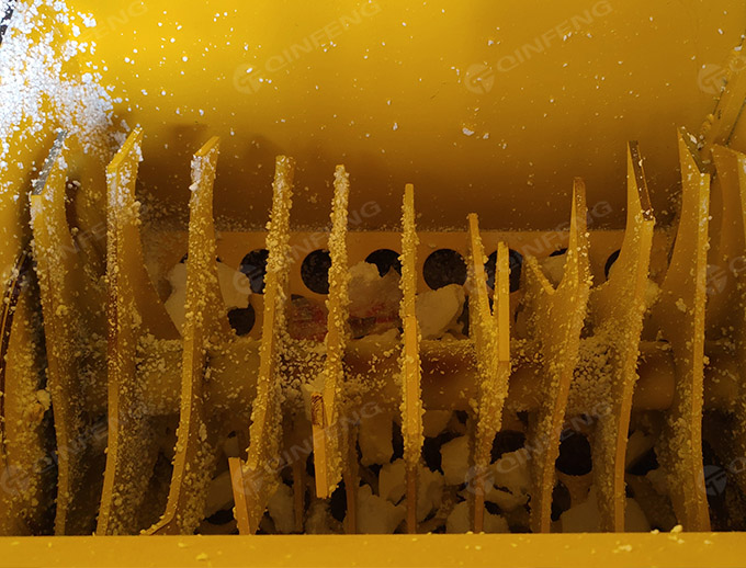 倾斜投料斗一便于投 EPS 物料,二物料不会在破碎过程中将物料推出料斗。发泡聚苯乙烯的热熔回收 机用破碎刀,平行放置的刀轴,刀轴上对称地固定有刀片,刀轴上的刀片相互错位排列,并且每根 刀轴上的相邻刀片以相同方向错开一定角度排列于刀轴上。物料破碎后用电机带螺杆压出成块。